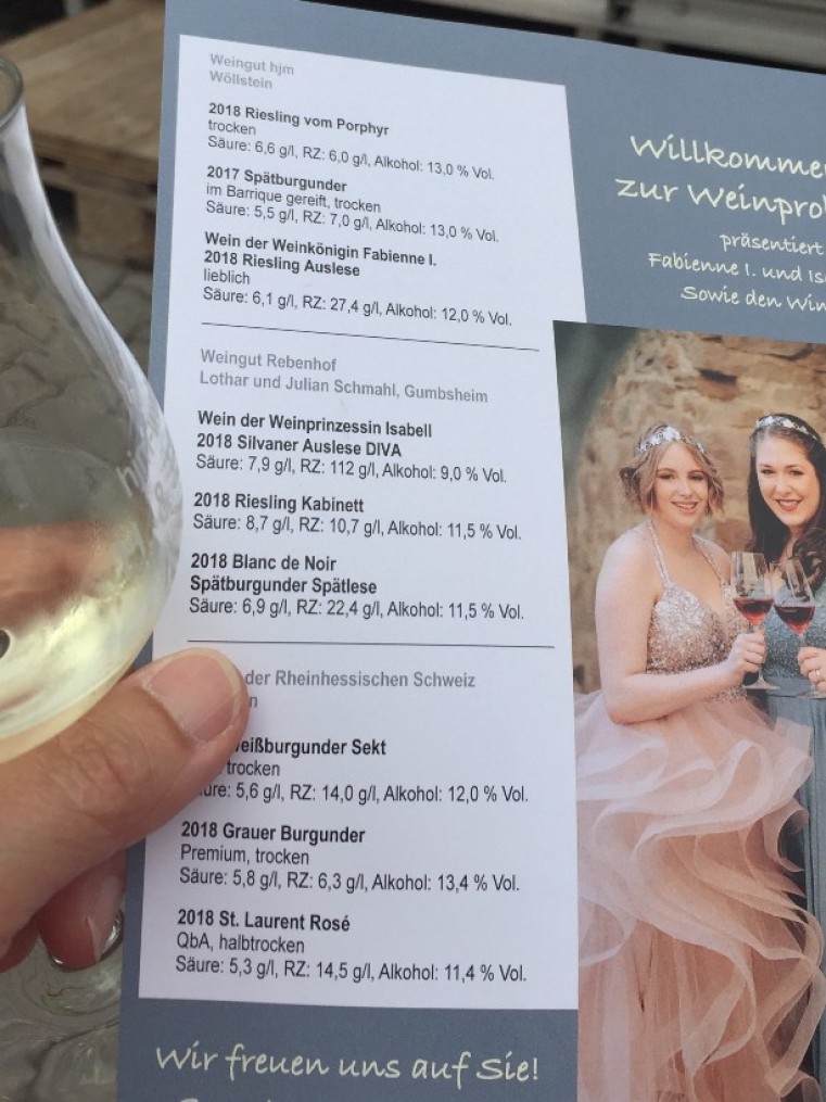 Die Ortsgemeinde Wöllstein hatte eingeladen und viele waren gekommen um teilzunehmen. Auch nur dabei sein und Freude haben war angesagt. Insgesamt gab des acht Weine und einen Sekt zu probieren und das zu einem Preis von nur 5 €. Gegen einen kleinen Spendenbetrag gab es sogar ein Foto mit allen Weinmajestäten :).