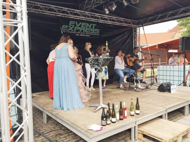 Die Ortsgemeinde Wöllstein hatte eingeladen und viele waren gekommen um teilzunehmen. Auch nur dabei sein und Freude haben war angesagt. Insgesamt gab des acht Weine und einen Sekt zu probieren und das zu einem Preis von nur 5 €. Gegen einen kleinen Spendenbetrag gab es sogar ein Foto mit allen Weinmajestäten :).