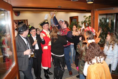 Letztlich gelang es den versammelten Narren doch, den Schlüssel zu erobern und die Ortsregierung bis Aschermittwoch zu übernehmen. Zur Besänftigung der Gemüter feierte man zusammen mit Weck, Worscht und Woi ausgelassen im Foyer des Gemeindezentrums.
