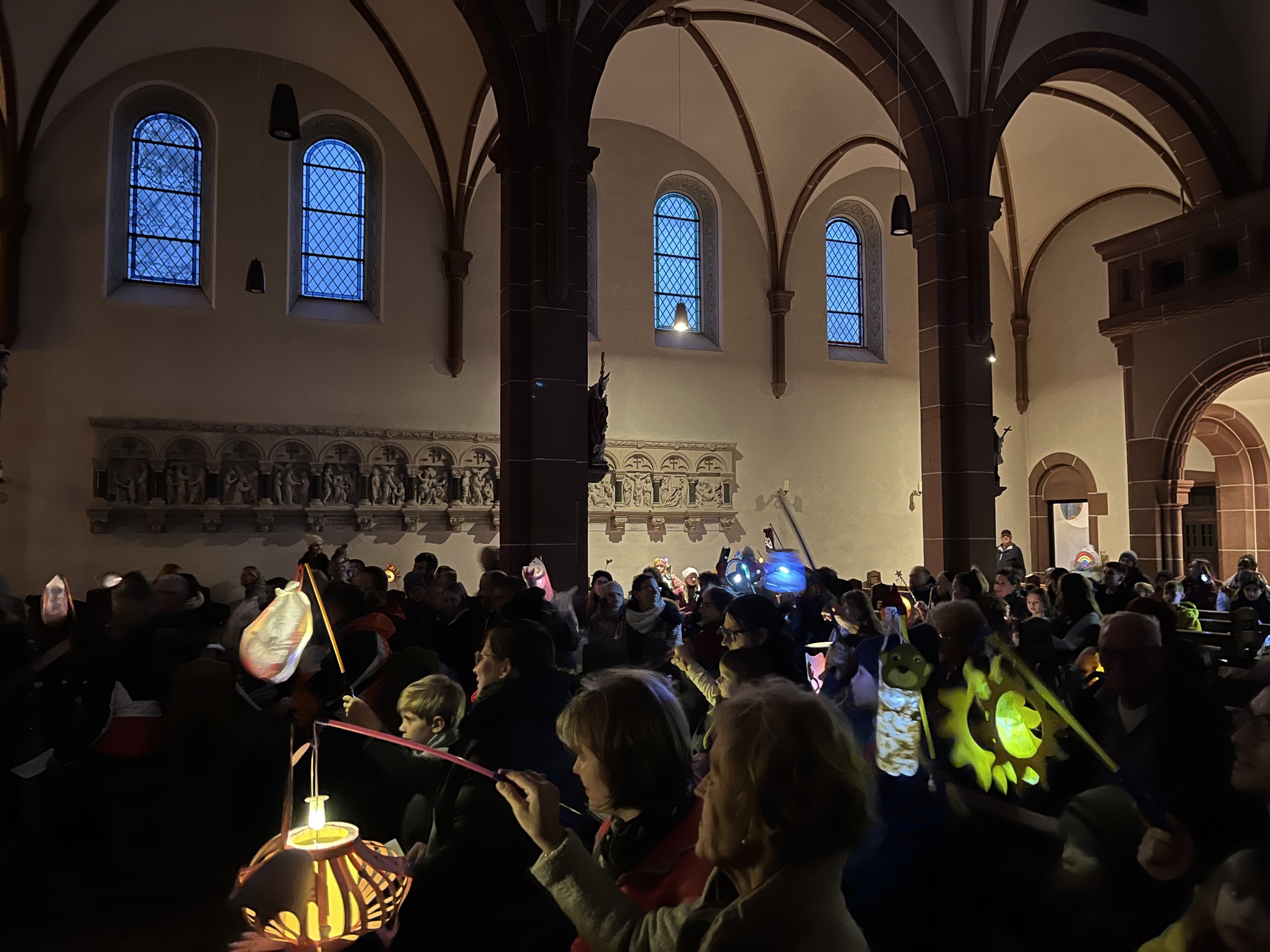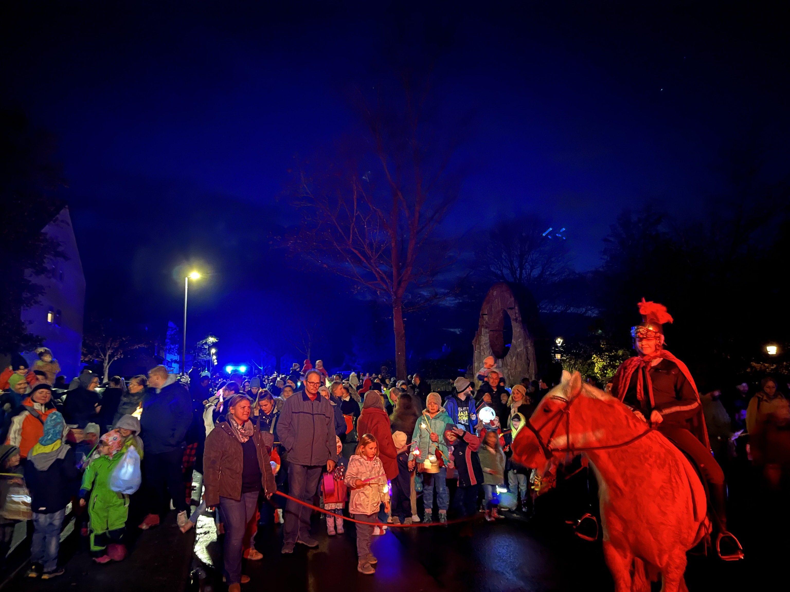 Viele hundert große und kleine Teilnehmer zogen dann mit einem bunten Laternenumzug durch die Wöllsteiner Straßen. Vorneweg ritt in diesem Jahr wieder ein St. Martin auf dem Pferd, was besonders viele Kinderaugen strahlen ließ. Unterwegs wurde an Stationen gemeinsam gesungen, mit musikalischer Begleitung des Bläser-Ensemble St. Johs.