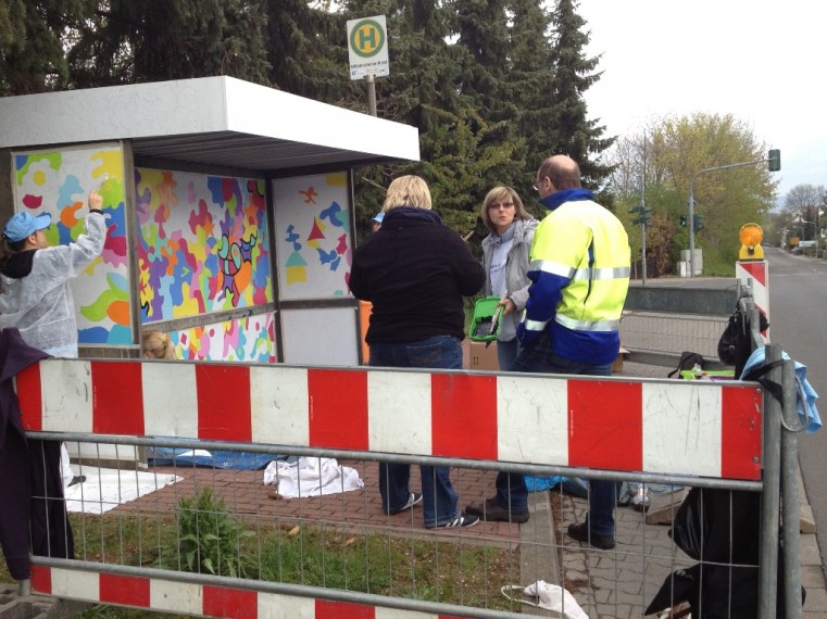 Dank des Engagements der Lehrerinnen Jutta Seitz und Barbara Seidenabel und zahlreicher Schülerinnen der 7. Klasse wird im Rahmen eines Schulprojektes aus der unschönen Haltestelle ein farbenfrohes und einmaliges Buswartehäuschen entstehen.