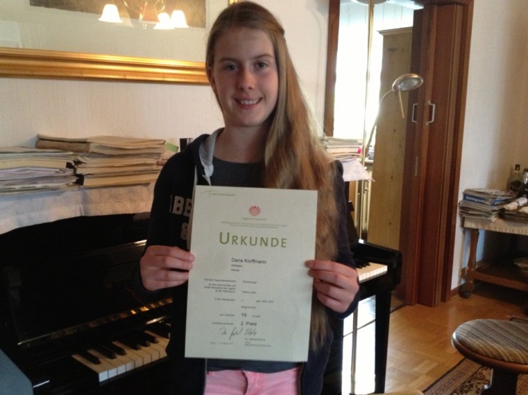 Die zum Zeitpunkt des Wettbewerbs noch 11-jährige Dana Korffmann hat mit der A-Dur Sonate Thema und Variationen von Mozart, Fantasie von Philipp Telemann und "River flows in you" von Yiruma dieses gute Ergebnis geschafft.