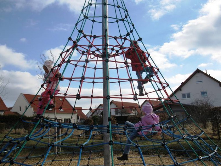Das Pyramidennetz lädt zum Klettern ein und die ersten Mutigen haben sich schon bis hoch in die Spitze gewagt.