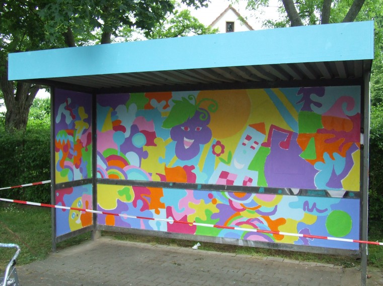Anlässlich der Projekttage „200 Jahre Rheinhessen“ der Realschule plus Rheinhessische Schweiz Wöllstein widmete sich die Gruppe von Kunstlehrerin Frau Jost dem Bushäuschen in Richtung Gumbsheim und haben diesem mit künstlerischen Mitteln ein neues, schöneres Aussehen geben.