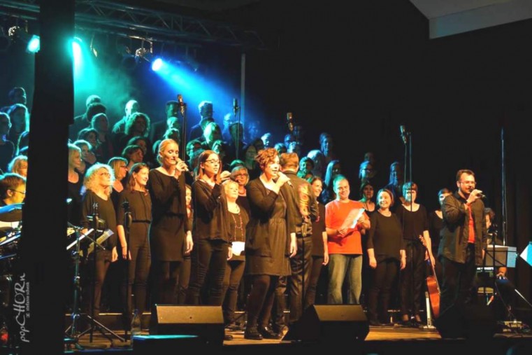 Und so wurde popCHORn zum Song „Adios“ mit Standing Ovations verabschiedet. Großen Applaus erhielten auch der Keyboarder, der Schlagzeuger, der E- und der Bassgitarrist, die den ganzen Abend über den Chor und die Solisten perfekt begleitet hatten. Auch die Techniker, die für den guten Ton, die Beleuchtungseffekte und die Einspielung von Bild- oder Textsequenzen gesorgt hatten, mussten auf die Bühne kommen und ihren Applaus abholen.