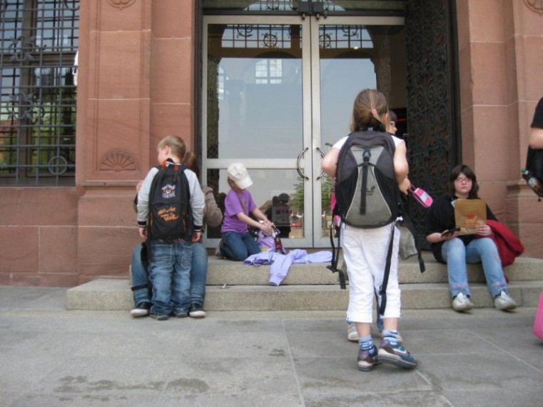 erwartungsvoll vor den Türen des Gemeindezentrums.
