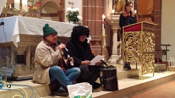 Pfarrer Todisco und Margot Haubs interpretierten die Geschichte des heiligen St. Martin neu und spielten zwei Obdachlose vor der Kirche, die sich riesig freuten, als ein kleines Kind eine große Martinsbrezel mit ihnen teilte.