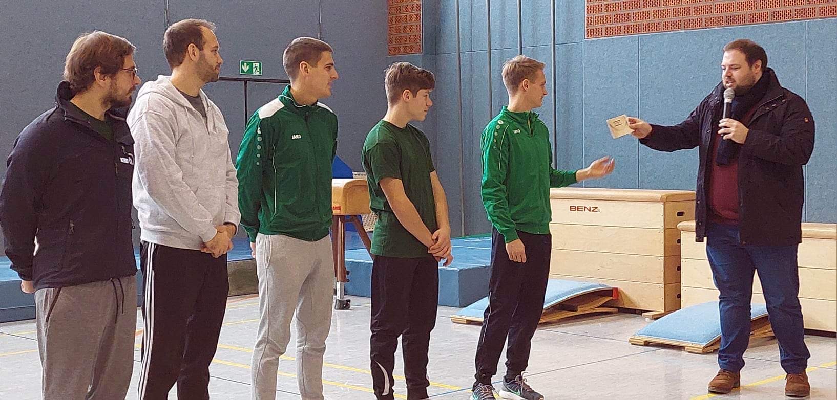 Außerdem konnte Ortsbürgermeister Johannes Brüchert auch der Turner-Herrenmannschaft zum erneuten Gewinn der Rheinland-Pfalz-Meisterschaft im Mannschaftsturnen gratulieren. „Wir sind stolz auf Euren tollen Erfolg und ihr seid großartige Botschafter für den Turnsport. Mit Eurem Meistertitel habt ihr erneut Wöllstein zum Mittelpunkt des Turnsports in Rheinland-Pfalz gemacht - dafür vielen Dank und herzlichen Glückwunsch!“ so Johannes Brüchert, der im Namen der Ortsgemeinde Wöllstein auch einen kleinen Gutschein überreichte.