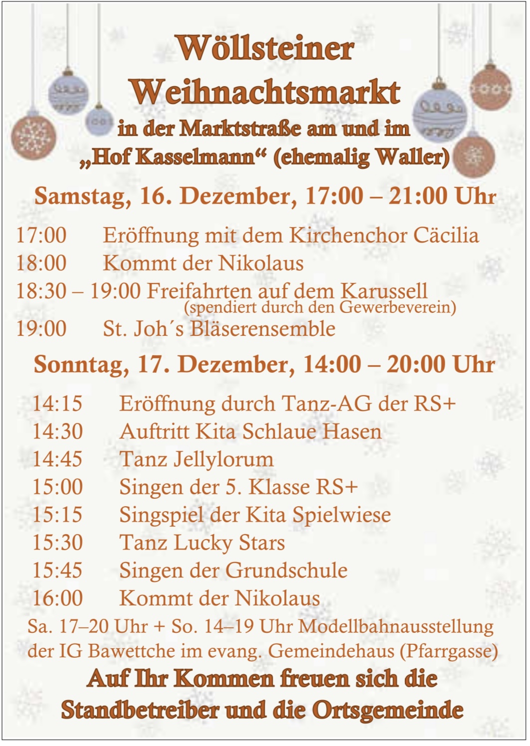 Auch konnte im zurückliegenden Jahr wieder in Wöllstein zusammen gefeiert werden. Im Juni fand zum ersten Mal der „Tag der Vereine“ im Gemeindezentrum statt, an welchem sich viele Vereine aus Wöllstein und Umgebung präsentiert haben und ihr breites Angebot vorstellten. Das Highlight im Veranstaltungskalender war natürlich wieder der Wöllsteiner Markt am ersten Septemberwochenende. Es waren 5 Tage voller Genuss und Lebensfreude rund um das Gemeindezentrum und in der schönen Wein- und Genussstraße. Am dritten Adventswochenende konnte auch wieder Weihnachtsmarkt gefeiert werden und dieser lockte viele Gäste in die Marktstraße, in diesem Jahr erstmalig in den Hof Kasselmann – ehemals Waller. Aber auch die Partnerschaften mit den Partnergemeinden Great Barford, welche in Wöllstein zu Besuch waren oder Barsac, welche wir mit einer kleinen Delegation besucht haben, konnte wieder gepflegt werden. Hier freuen sich die Freunde der Partnerschaften über Interessenten und neue Partnerschaftsfreunde!