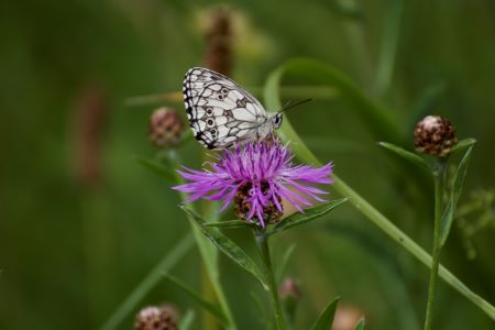 Auf ihren Blüten verweilt gerne der Schachbrettfalter. Das Foto zeigt den schönen Tagfalter auf unserer Blühwiese beim Nektar saugen.