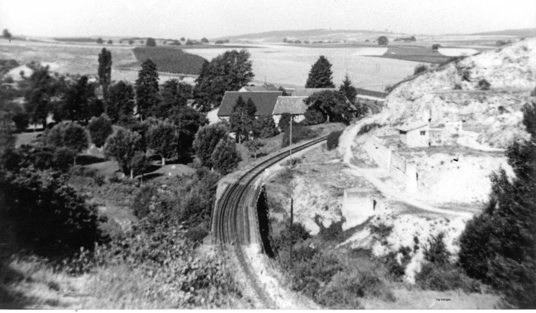 Gleisanlage auf der Appelbachbrücke von oben, rechts Steinbruch, Ölmühle im Hintergrund